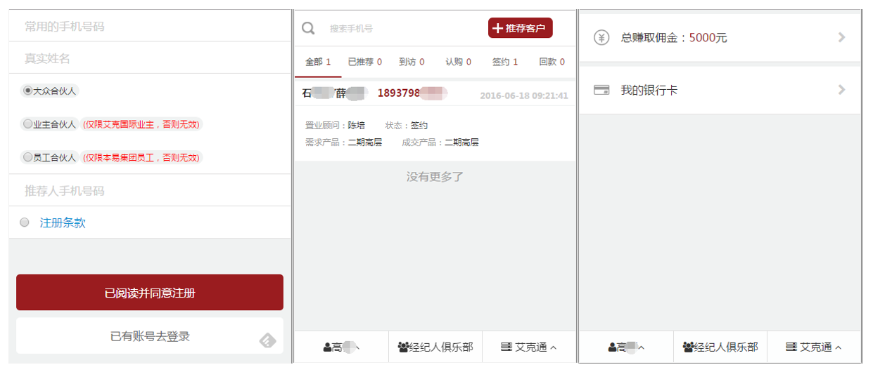 客戶注冊:擁有微信并關(guān)注公眾號,即可注冊申請成為全民營銷系統(tǒng)的用戶(全民經(jīng)紀(jì)人)。注冊用戶可隨時(shí)通過微信查看已經(jīng)推薦的客戶信息、購房進(jìn)度、傭金結(jié)算情況。