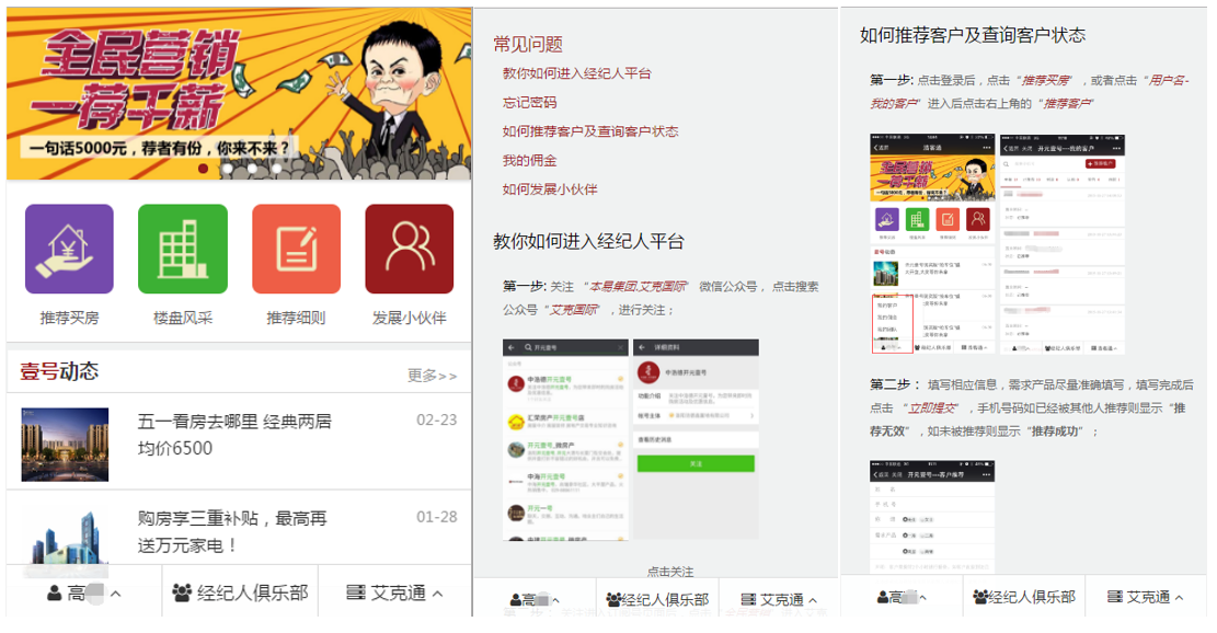 客戶注冊:擁有微信并關(guān)注公眾號,即可注冊申請成為全民營銷系統(tǒng)的用戶(全民經(jīng)紀(jì)人)。注冊用戶可隨時(shí)通過微信查看已經(jīng)推薦的客戶信息、購房進(jìn)度、傭金結(jié)算情況。